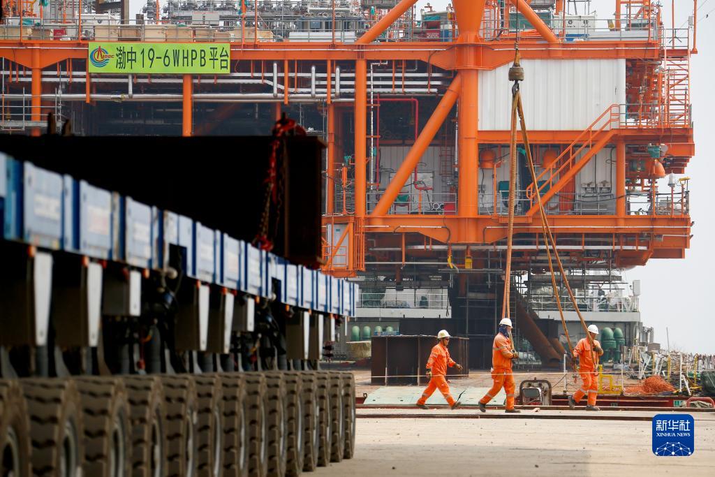 8月9日,在天津?yàn)I海新區(qū)海油工程智能化制造基地,工人進(jìn)行組塊裝船前的準(zhǔn)備工作。新華社發(fā)(杜鵬輝攝)