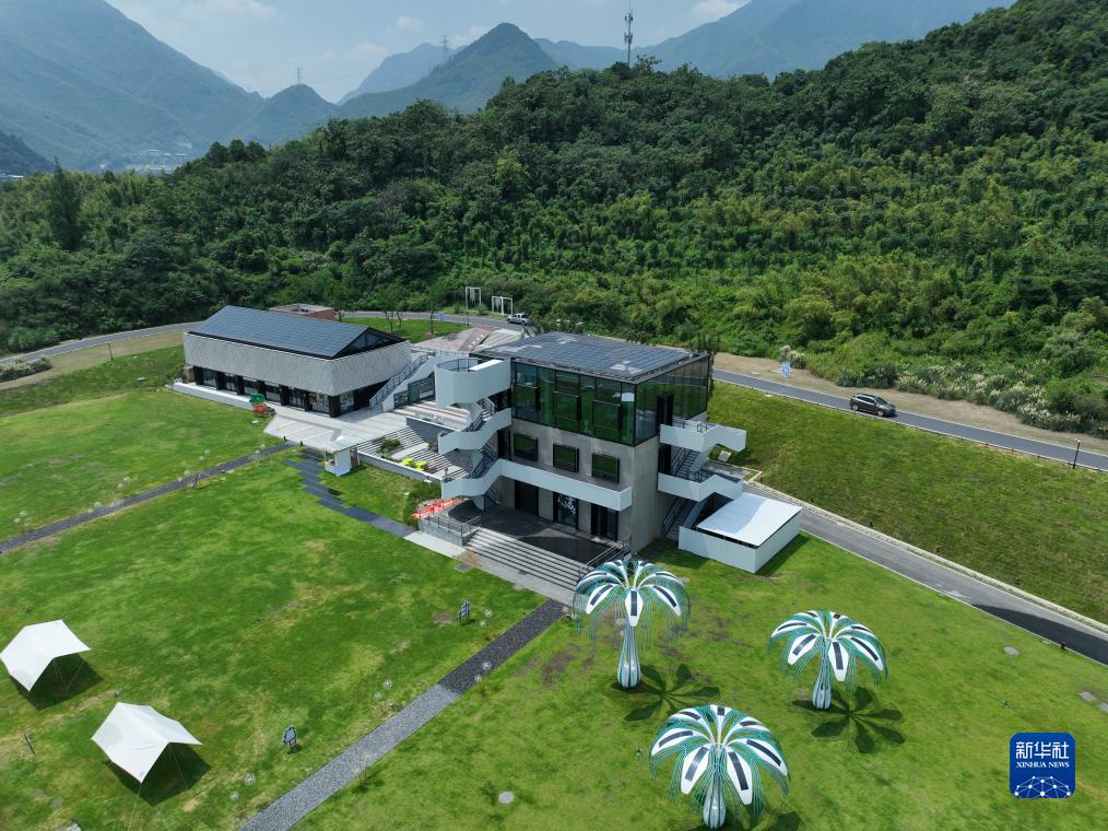8月11日拍攝的余村未來(lái)圖書館,該建筑主要通過(guò)鋪設(shè)在屋頂上的光伏發(fā)電系統(tǒng)和“光伏樹”供電(無(wú)人機(jī)照片)。