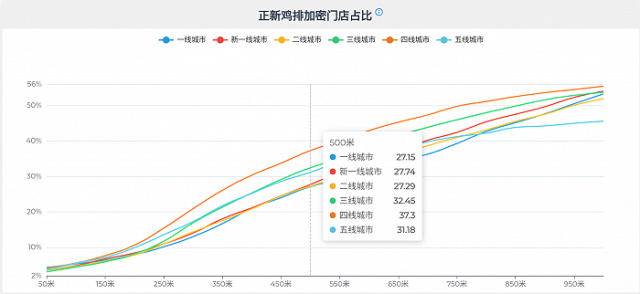 從極海品牌監(jiān)測的數(shù)據(jù)來看,在門店占比超過50%的三四五線城市里,正新門店位于“已有門店周圍500米”距離的“加密門店”的占比都超過30%,其中,四線城市甚至超過37%。在深圳,界面新聞留意到,在華強(qiáng)北附近,也依然存在正新雞排相距100米“緊挨”著開店的現(xiàn)狀。