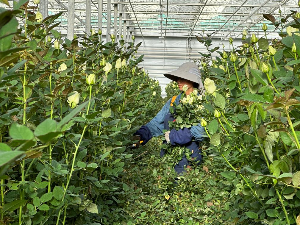 脫去厚重的外套,張小紅換上輕便的工作服,戴好手套和帽子,拿起大剪刀,開始了一天的剪花工作。只見她走進(jìn)幽深窄密的綠色長廊,直到看不見人影。少許時刻,她便抱著一大捧玫瑰走了出來,新鮮的露水從嬌嫩的花瓣上滴落。平板車?yán)锸M清水,她和其他工人們一起,將新鮮采摘的玫瑰用網(wǎng)紗細(xì)心地裹好,然后放置水中。再過不久,這些玫瑰將被運(yùn)往全國各地甚至海外,為人們帶來愉悅和享受。