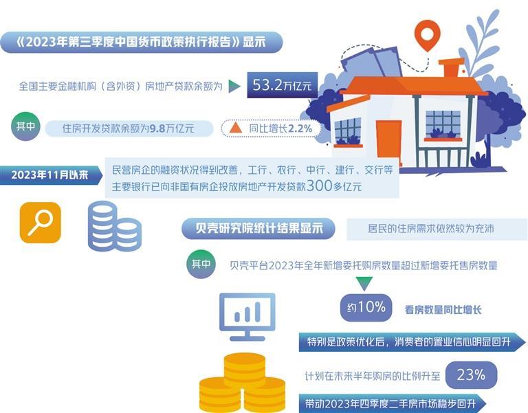 從銀行信貸角度看,房地產(chǎn)信貸融資的規(guī)模、結(jié)構(gòu)整體穩(wěn)定?!?023年第三季度中國貨幣政策執(zhí)行報告》顯示,全國主要金融機(jī)構(gòu)(含外資)房地產(chǎn)貸款余額為53.2萬億元,其中,住房開發(fā)貸款余額為9.8萬億元,同比增長2.2%。2023年11月以來,民營房企的融資狀況得到改善,工行、農(nóng)行、中行、建行、交行等主要銀行已向非國有房企投放房地產(chǎn)開發(fā)貸款300多億元。