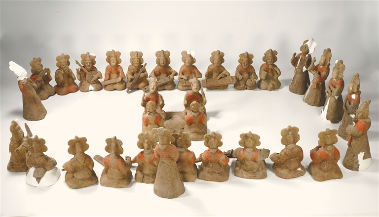 布里村的十六國大墓M63前室內(nèi)出土的樂俑(資料照片)。