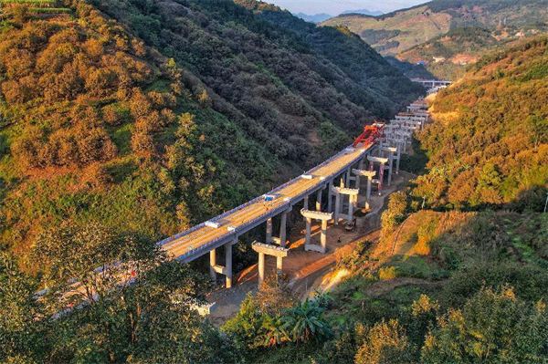 隆林樞紐立交橋,從航拍圖上看,通向四方的幾條匝道像是龍爪,主線似龍身,組成了猶如盤踞在山間的“龍”。在架設(shè)匝道T梁時,按照施工組織設(shè)計,T梁從D匝道推進到上跨汕昆高速公路單獨的鋼箱梁吊架是已經(jīng)合龍的。但架梁展開時意外出現(xiàn),鋼箱梁因其他原因未能到位——似乎成了考驗魏玉“虎”能否撼動這條“龍”的試金石。魏玉虎應(yīng)急預(yù)案祭出:運梁車把T梁運到鋼箱梁附近,吊車把3跨梁吊架到鄰近D匝道的A匝道上,架橋機通過過渡工程,在A匝道繼續(xù)架梁;A匝道就成為關(guān)鍵線路,項目部立即集中火力搶做A匝道上的橋墩,確保架梁能繞道繼續(xù)前進。這可以說“虎”勝“龍”。
