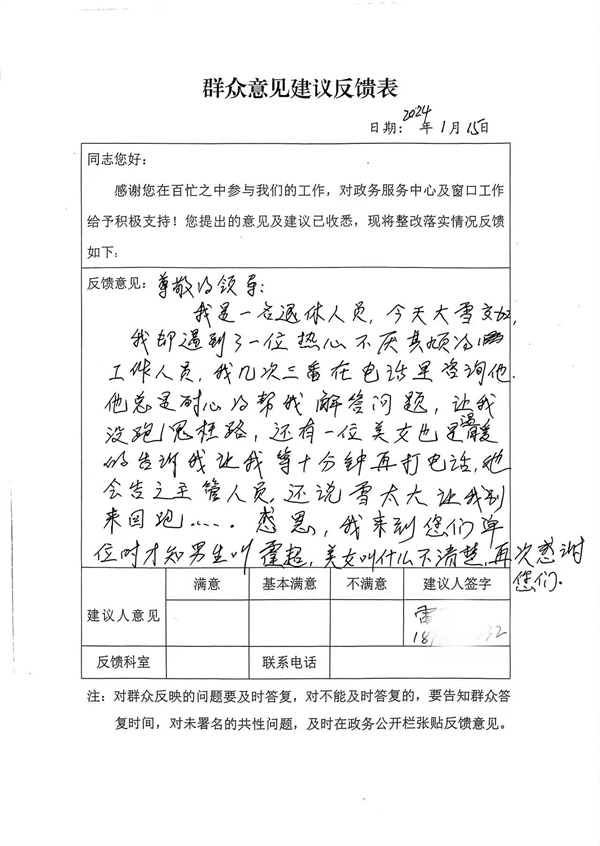 西部決策網(wǎng)訊 “今日大雪交加,我卻遇到了一位熱心細(xì)心、不厭其煩的工作人員,我?guī)状稳陔娫捓镒稍兯?,他總是耐心的幫我解決問題,讓我沒跑冤枉路,還有一位美女也是溫暖的告訴我,讓我等十分鐘再打電話,她會(huì)告知主管人員,還說雪太大讓我別來回跑,感恩......我來到您們單位時(shí)才知男生叫霍超,美女叫什么不清楚,再次感謝您們!”市民雷女士在群眾意見反饋簿上,用“熱心、耐心、溫暖、感恩、感謝”等贊許,表達(dá)了對(duì)政務(wù)大廳工作人員的肯定。