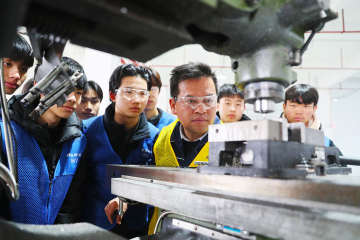 2024年1月9日,在湖南省永州市新田縣產(chǎn)業(yè)開(kāi)發(fā)區(qū)永州群翰科技有限公司車間,新田縣職業(yè)中等專業(yè)學(xué)校學(xué)生在工廠師傅的指導(dǎo)下學(xué)習(xí)機(jī)床操作技術(shù)。近年來(lái),該校聯(lián)合企業(yè)開(kāi)展“產(chǎn)教融合、校企辦學(xué)”模式,助推就業(yè)創(chuàng)業(yè)。新華社發(fā)(劉貴雄 攝)