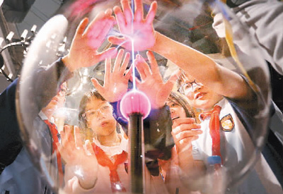 學(xué)生們?cè)趶V東科學(xué)中心觀察和體驗(yàn)“輝光球”放電現(xiàn)象。黃繼明攝(人民圖片)