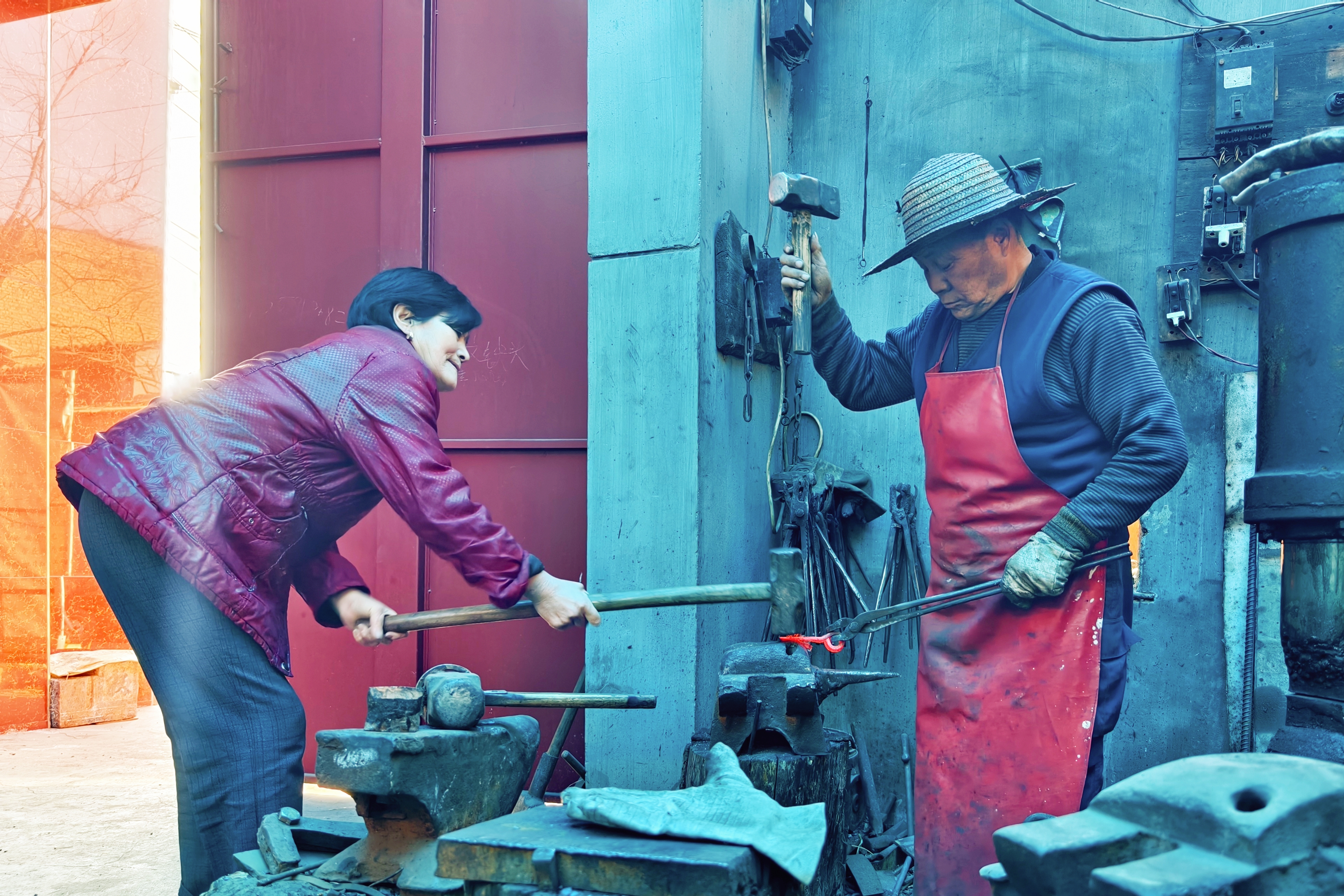 2024年1月4日上午,記者來到東車村,找到了屈希望的家,只見屈師傅和老伴正在自家的打鐵鋪鍛造農(nóng)具。70歲的屈希望從事打鐵工作已有50多年,是陜西省非物質(zhì)文化遺產(chǎn)傳統(tǒng)打鐵技藝代表性傳承人,其代表作有鎬、犁、鏵,鍋、鏟、鐵勺等生產(chǎn)用具和刀劍等冷兵器時(shí)代的兵器。