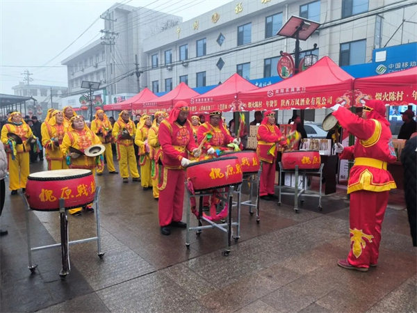 上午九時,活動現(xiàn)場人聲鼎沸,熱鬧非凡。省級非物質文化遺產項目“槐原戰(zhàn)鼓”氣勢恢宏,擂響了煙火陳村促經濟,家鄉(xiāng)年貨帶消費的新征程。
