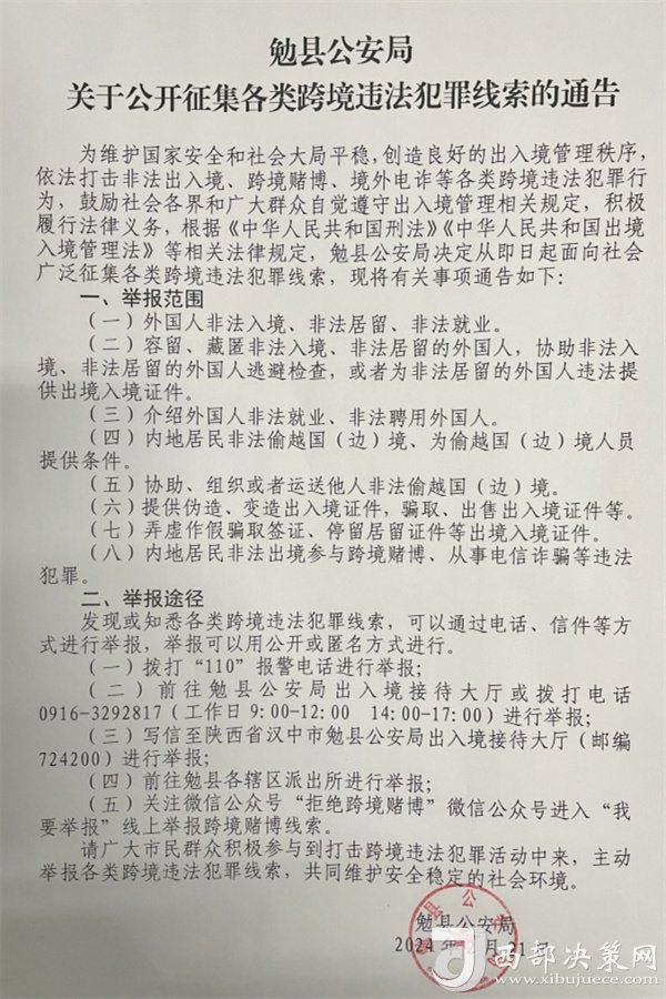 西部決策網(wǎng)訊 為維護(hù)國家安全和社會大局平穩(wěn),創(chuàng)造良好的出入境管理秩序,依法打擊非法出入境、跨境賭博、境外電詐等各類跨境違法犯罪行為,鼓勵社會各界和廣大群眾自覺遵守出入境管理相關(guān)規(guī)定,積極履行法律義務(wù),根據(jù)《中華人民共和國刑法》《中華人民共和國出境入境管理法》等相關(guān)法律規(guī)定,勉縣公安局決定從即日起面向社會廣泛征集各類跨境違法犯罪線索,現(xiàn)將有關(guān)事項通告如下: