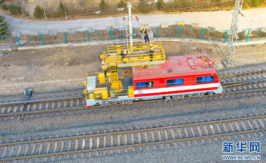 春運期間,在隴海鐵路虢鎮(zhèn)至陽平區(qū)段,劉建強(qiáng)和他的工友們在供電接觸網(wǎng)軌道作業(yè)車上進(jìn)行檢修作業(yè)。劉一江 航拍