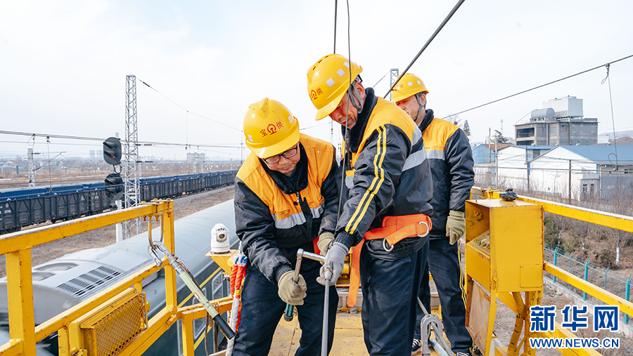 在隴海鐵路虢鎮(zhèn)至陽平區(qū)段,劉建強(qiáng)(左)和工友們在供電接觸網(wǎng)軌道作業(yè)車上緊固供電設(shè)備接觸網(wǎng)腕臂支撐。劉一江 攝