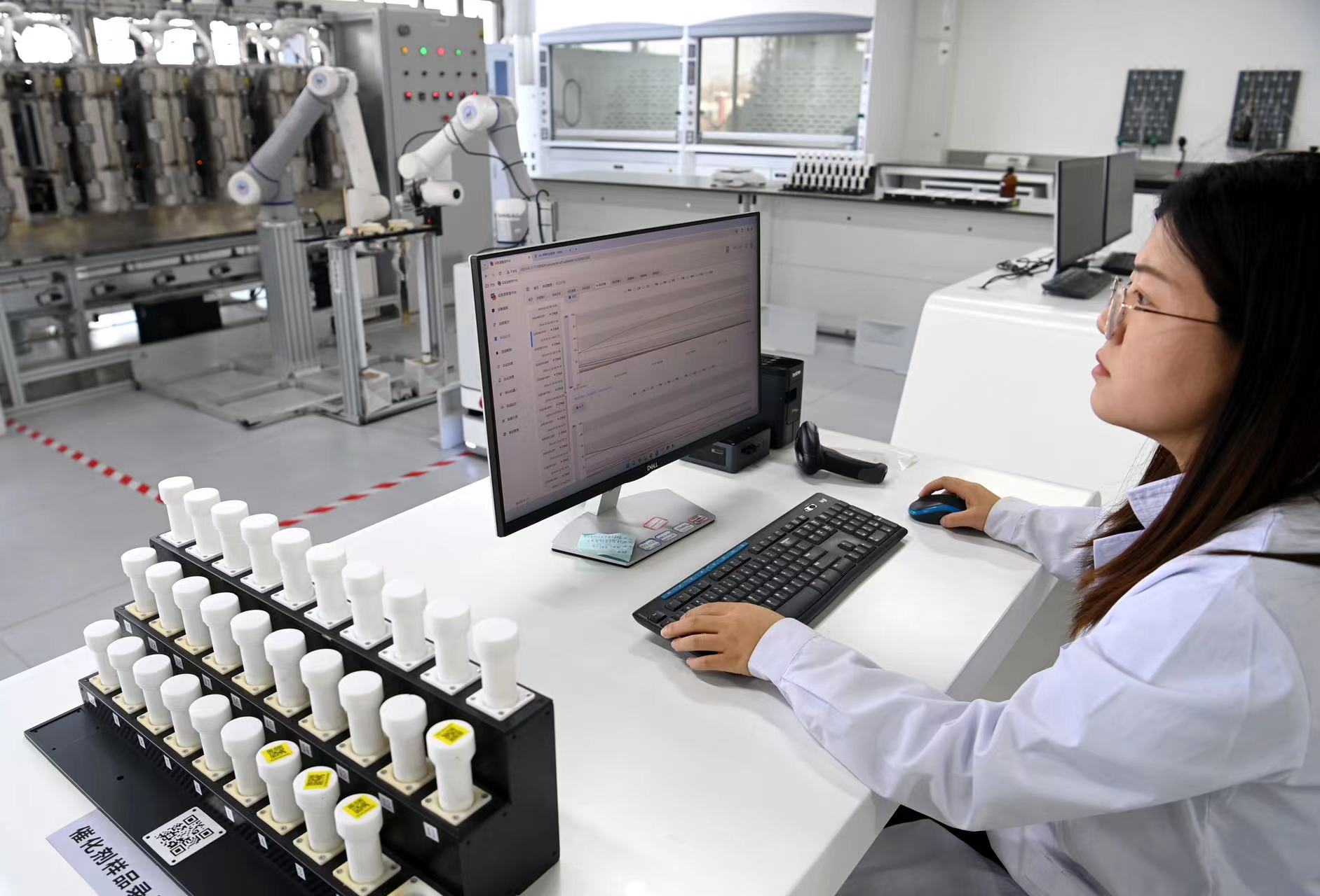 2月28日,在榆林中科潔凈能源創(chuàng)新研究院基于人工智能的高通量催化反應(yīng)研究平臺實驗室,工藝專干黨小梅在進行實驗。新華社記者鄒競一 攝